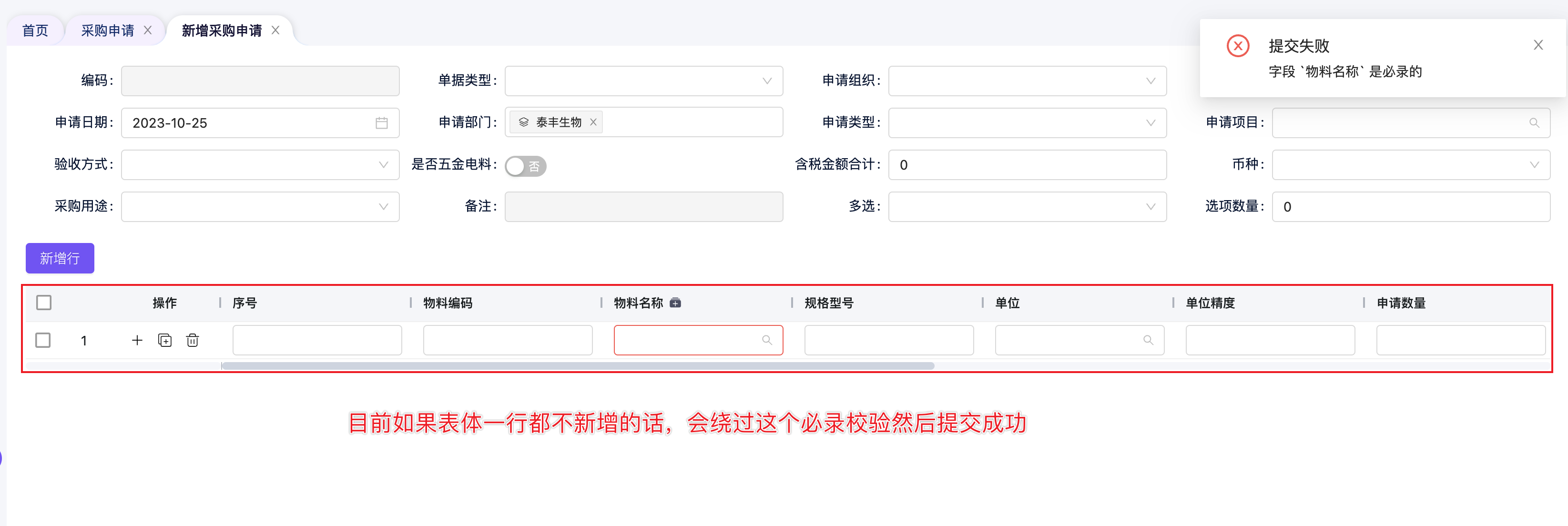 我在表体里面设置了”物料名称“这一列为必录的,目前的效果是如果表体里有新增行,这一列为空的时候提交会有必录校验,但如果我表体一行都不添加的时候,就能绕过这个必录校验了,这个该怎么办?