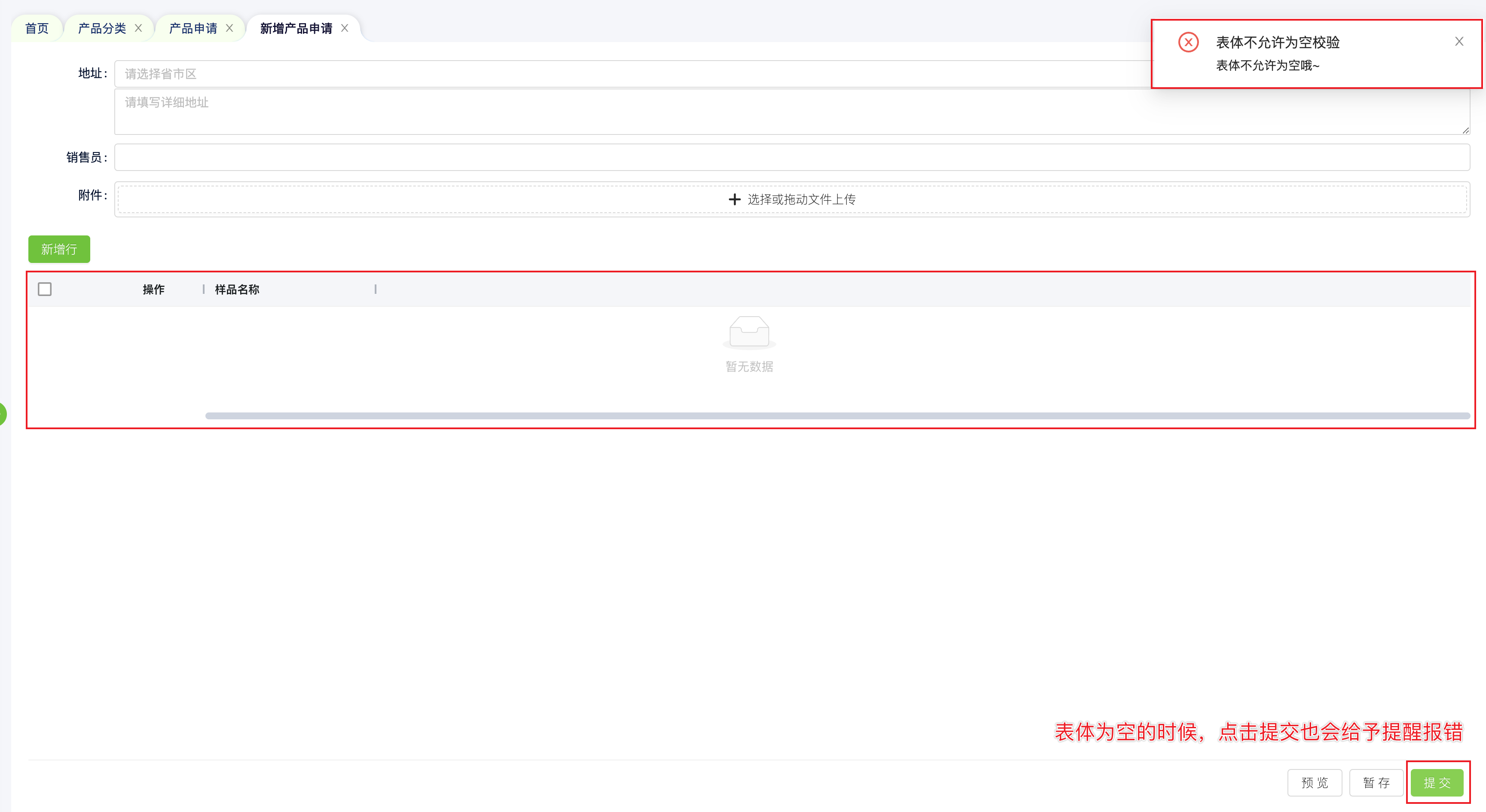 按照你的描述,应该是想实现“表体不允许为空”的校验,这个可以在“提交”按钮的表单事件上增加一个“校验规则”去实现,具体的配置步骤如下:
