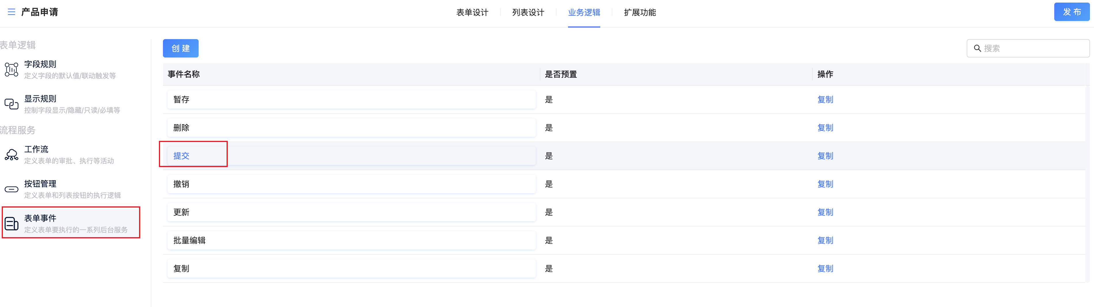 1、进入这个表单的设计时,在“业务逻辑”中找到“表单事件”,找到“提交”事件:
