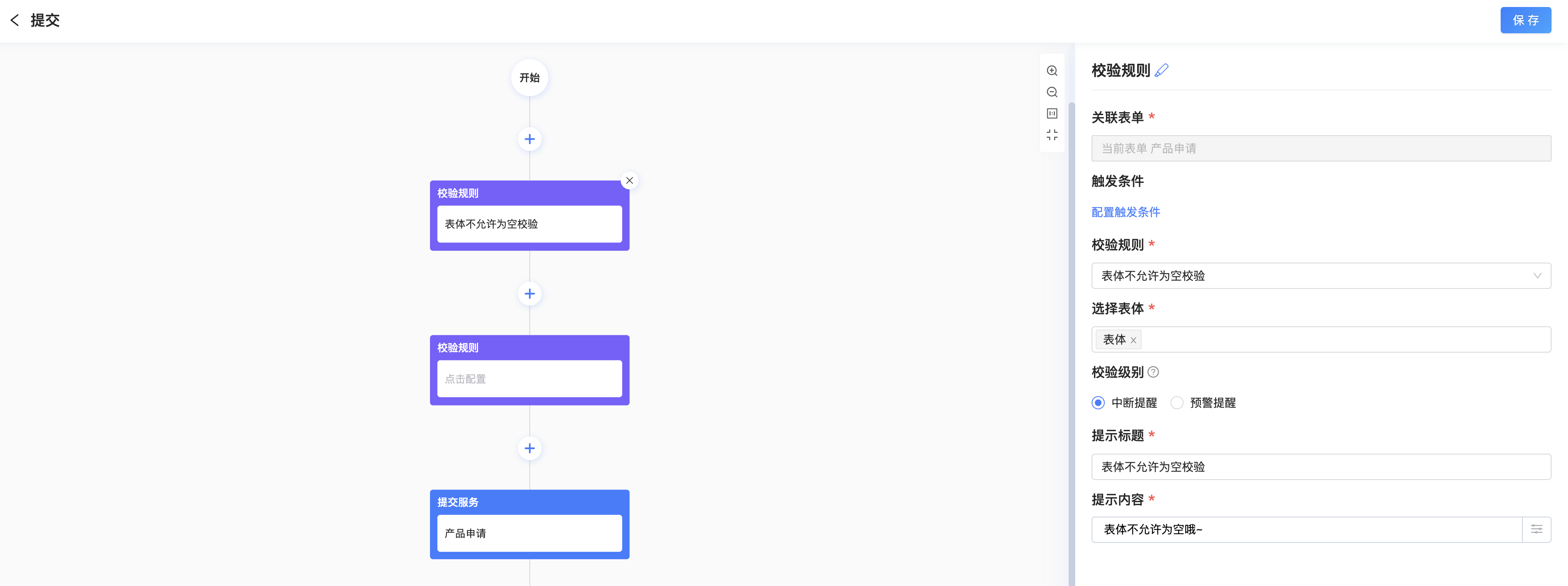 2、然后在前面增加一个“校验规则”的节点,配置选择“表体不允许为空”的校验规则,选择想要校验的表体,提示标题和文案的内容也是可以自定义的: